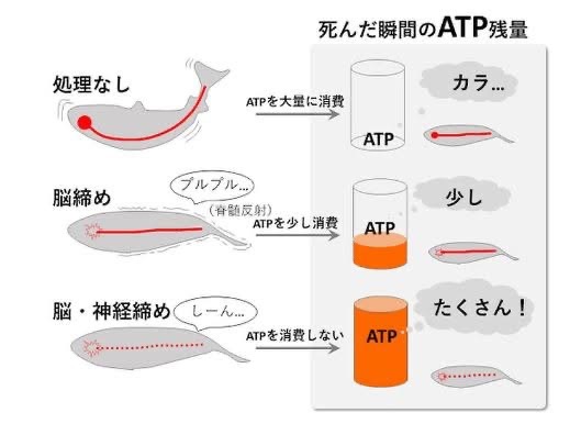 ATPは、死後に旨味成分であるIMPへと変化する重要な物質であり、生前から死直後にかけて無駄に消費させないことが、味の設計に直結する。