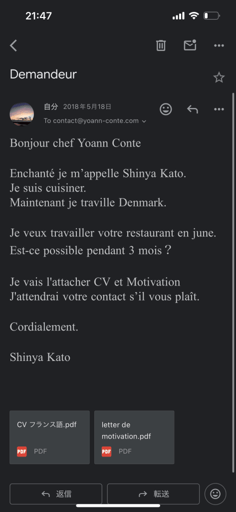 (今の時代、実際この手段をやる人は少ないと感じますし、デンマークのレストランからは今時、手紙を送ってくる子なんていないよ!ぜひ一緒に働かないか!とも返事がきた事もあります。)