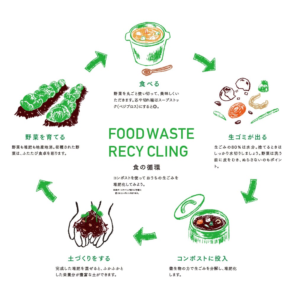 Rot = Compost (コンポスト) することで土に還し、次の食物生産に役立てる。