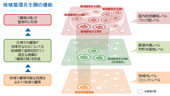 地域資源を活用して環境・経済・社会の統合的向上を実現する事業を生み出し、地域の個性を活かして、地域同士で支え合うネットワークを形成していく自立・分散型社会という考え方。 - 他にも、地域で循環できるものはその地域で循環させ、循環が難しいものについては広域的なネットワークを築いて対応するという重層的な循環の形成を目指すという定義もあります。